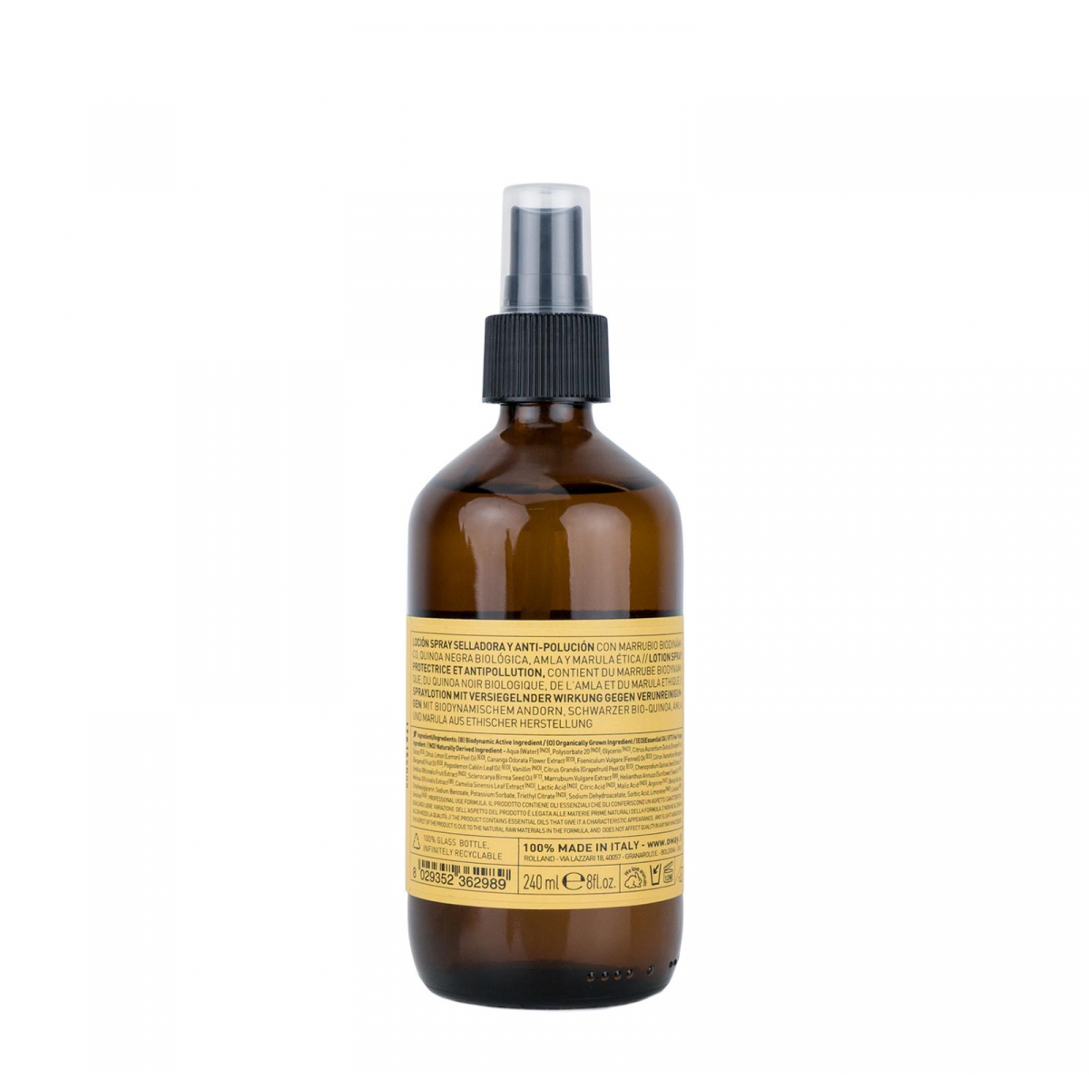 Aqua (Water) (ND), Polysorbate 20 (ND), Glycerin (ND), Citrus Aurantium Dulcis (Orange) Pell Oil (EO), Juniperus Virginiana Oil (EO), Citrus Aurantium Bergamia (Bergamot) Fruit Oil (EO), Cananga Odorata Flower Oil (EO), pelargonium Graveolens Oil (EO), Citrus Medica Limonum (Lemon) Fruit Oil (EO), Pogostemon Cablin Oil (EO), Vanillin (ND), Foeniculum Vulgare (Fennel) Oil (EO), Citrus Grandis (Grapefruit) Peel Oil (EO), Chenopodium Quinoa Seed Extract (O), Emblica Officinalis Fruit Extract (ND), Sclerocarya Birrea Oil (FT), Marrubium Vulgare Extract (B), Helianthus Annuus (Sunflower) Seed Oil (ND), Melissa Officinalis Extract (B), Camelia Sinensis Leaf Extract (ND), Lactic Acid, Citric Acid (ND), Malic Acid, Arginine, Sodium benzoate, Potassium Sorbate, Triethyl Citrate, Chlorphenesin, Methylisothiazolinone, Citronellol, Coumarin, Geraniol, Linalool, Limonene. (B) Biodynamic Active ingredient/ (O) Organically Grown Ingredient/ (EO) Essential Oil/ (FT) Fair Trade Ingredient/ (ND) Naturally Derived Ingredient