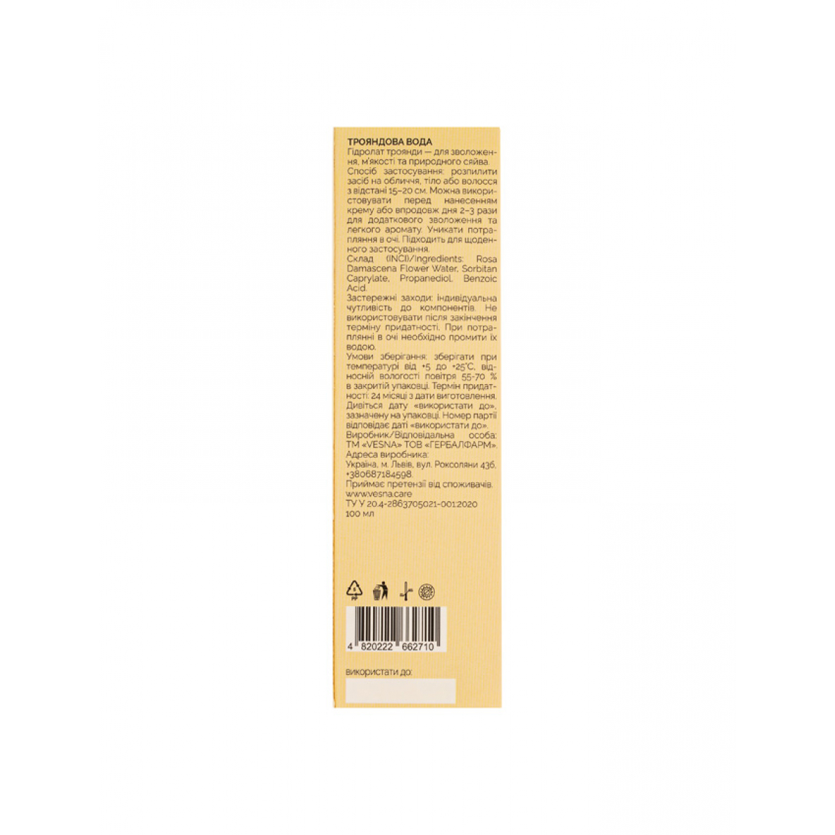 VESNA Розовая вода, 100 ml 2228